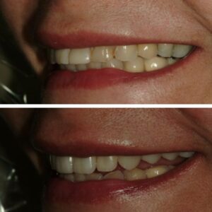 Aura had been a patient in Dr. Engelberg’s Arlington Heights, Illinois dental office for years when she opted to restore her damaged teeth with definitive porcelain restorations. As you can see, her front teeth contained failing and leaking bonding material as well as other types of dental work. Dr. Engelberg’s photography enabled Aura to help fulfill and exceed her treatment requests for long-lasting dentistry with the addition of a cosmetic dentistry component. A combination of seven porcelain crowns and one porcelain veneer restorations were placed on Aura’s upper teeth, and the lower teeth were reshaped to allow for great function. Aura is delighted with the results as you can see in her video testimonial!
